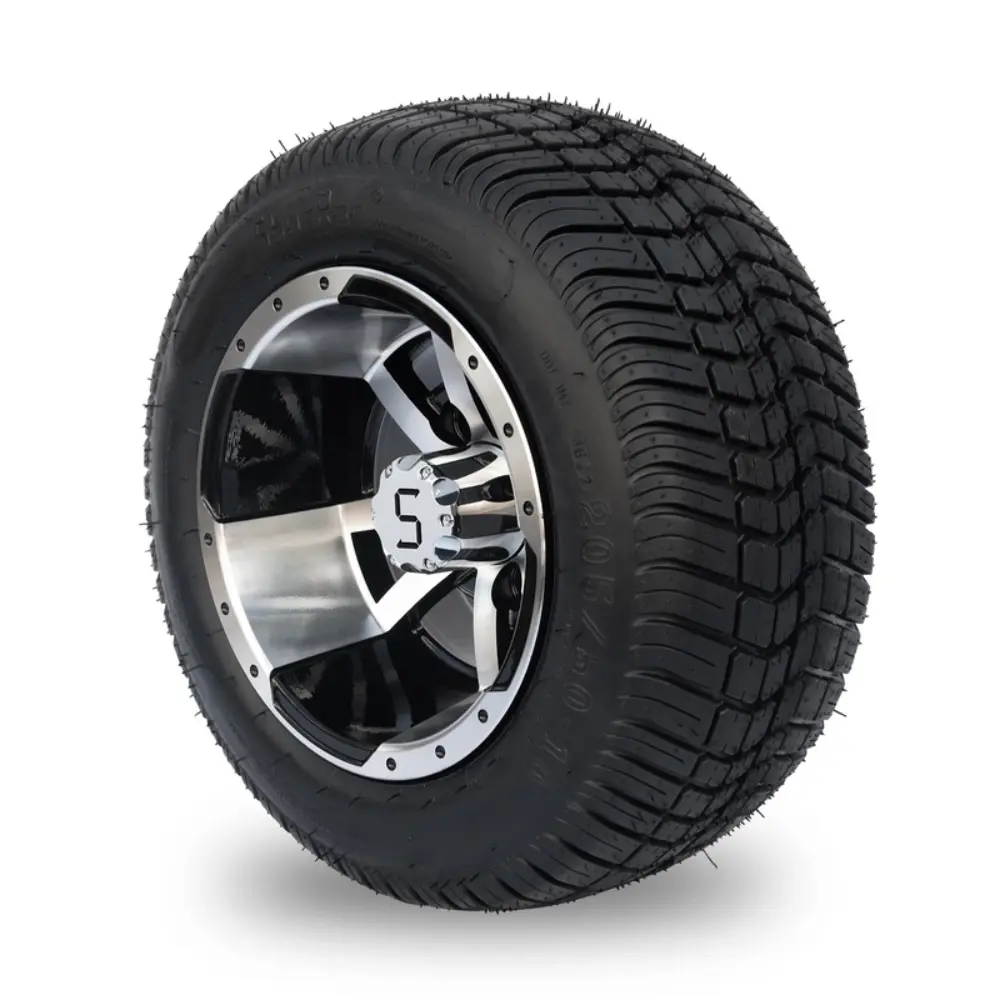 Enhance your golf cart with this 205/50-10 Machined/Gloss Black Tyre & Wheel Combo. Combining style and performance, it delivers excellent traction, a smooth ride, and a durable finish with a sleek machined/gloss look.